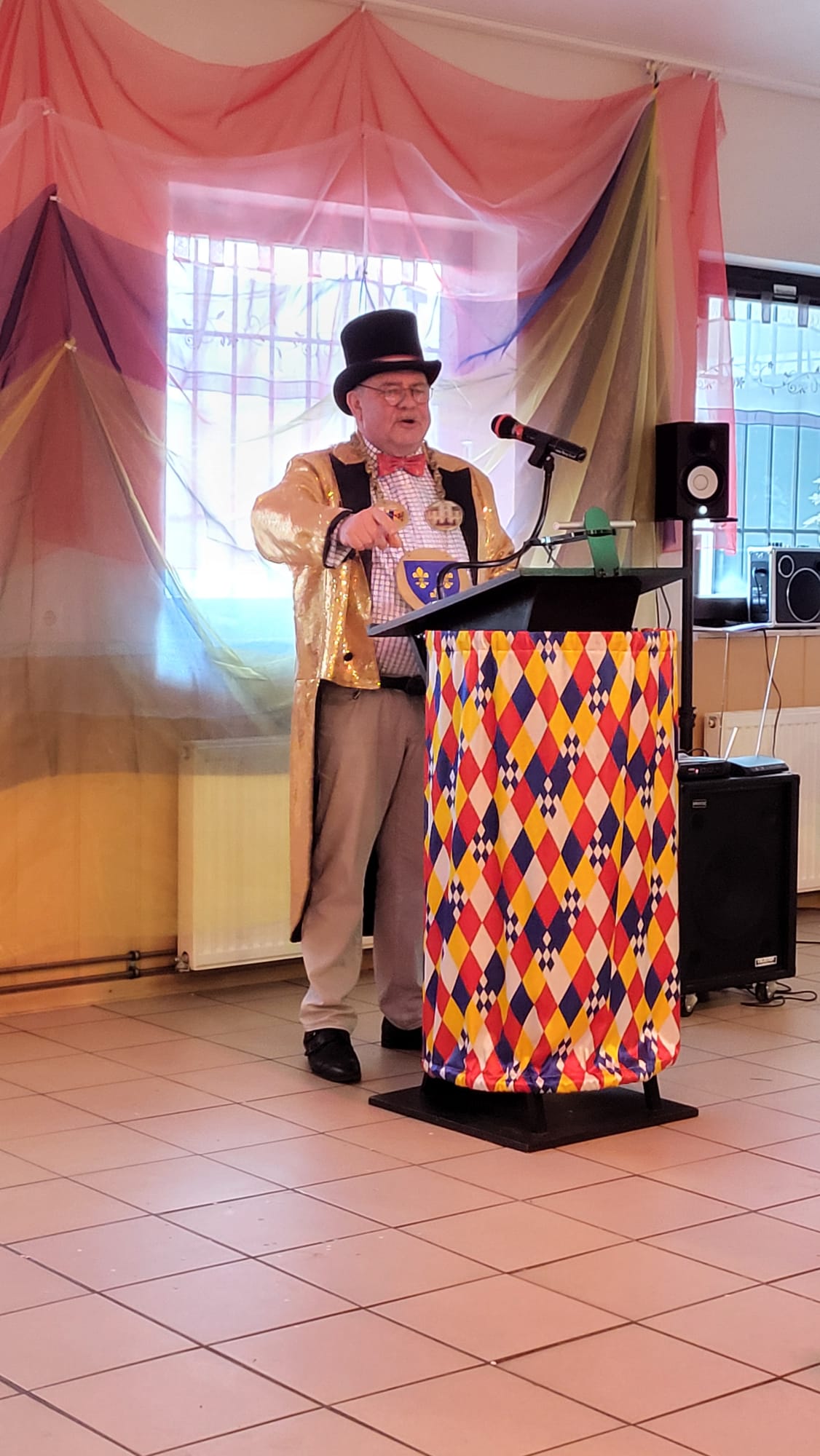 Gegen Ende der närrischen Runde stellte sich der Kandidat Nummer 11 für die am 9.März in Wiesbaden stattfindenden Oberbürgermeisterwahl vor. „Drum seid jetzt alle klug und schlau, wählt vierfarbbunt: rot, weiß, gelb, blau!“ so die Aufforderung von Stefan Fink! In einem eines Oberbürgermeisters würdigen Gewand und bescheidener Amtskette hielt das Wiesbadener Bütten-Ass wieder einen tollen Vortrag. Seit seinem 14. Lebensjahr steht der neue Wiesbadener Stadtmarschall in der Bütt und das seit Jahrzehnten auch in der Schiersteiner AWO-Bütt.
