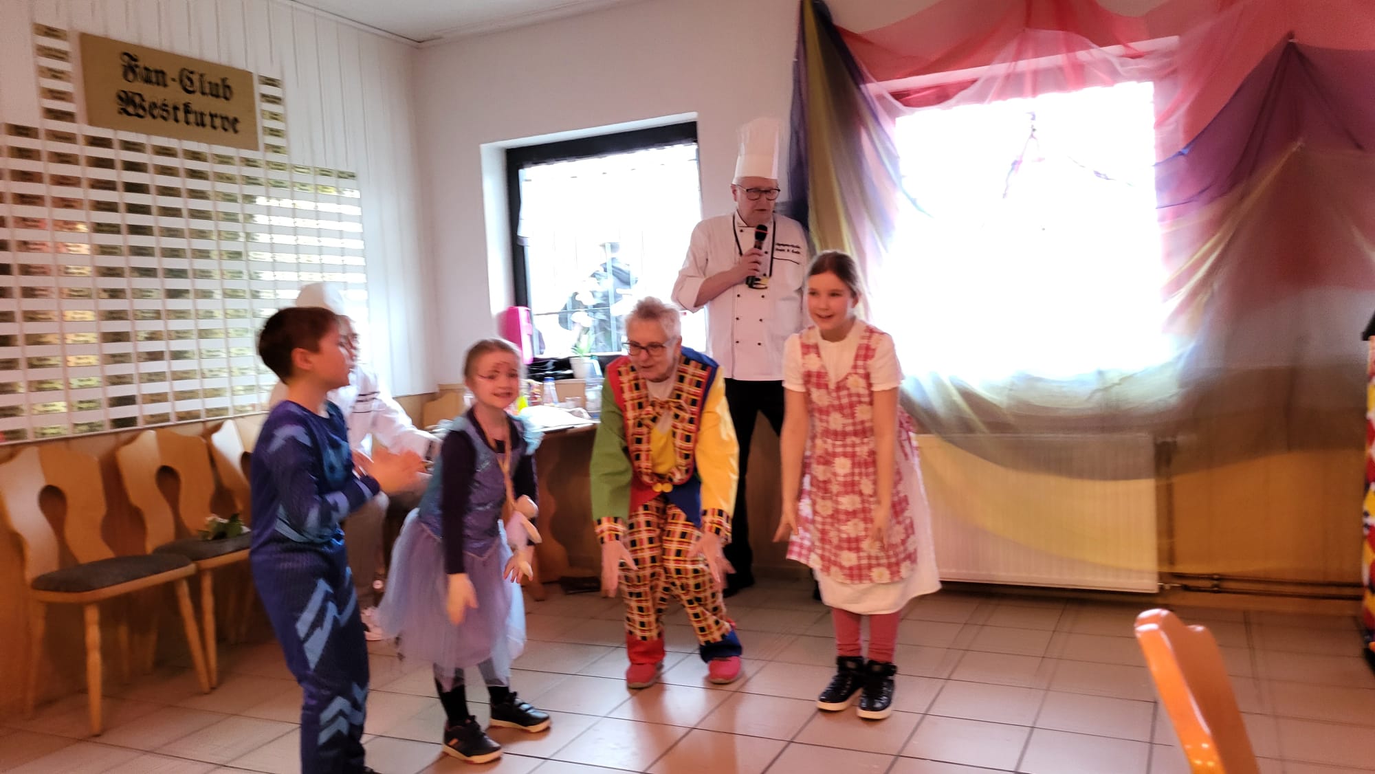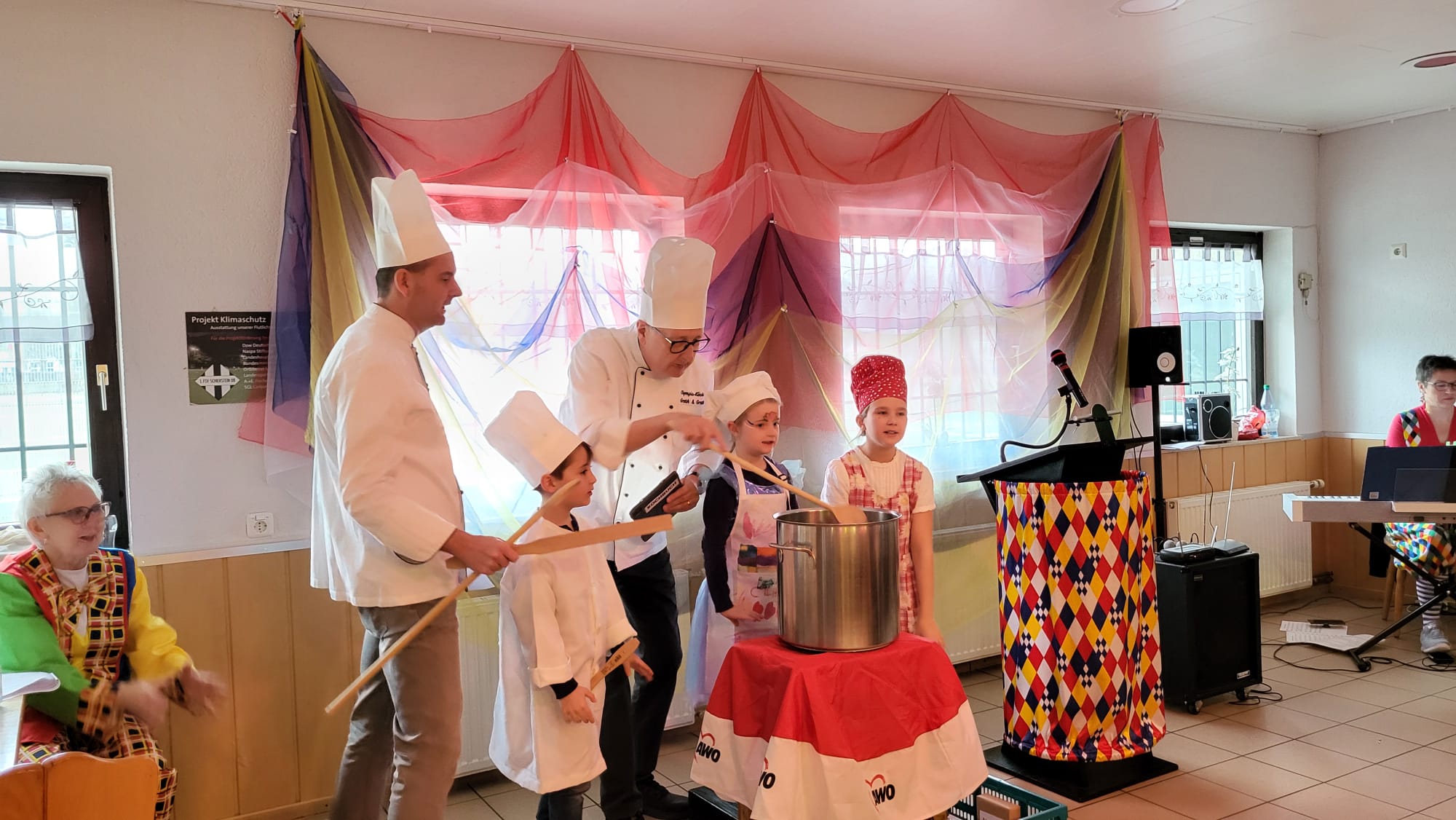 Traditionell eröffnete die Groth-Familie den Kreppelkaffee. In diesem Jahr gelang es dem Alt-Meister Hans, dem mittelalten Jungkoch Lars sowie den Auszubildenden Marlene, Clara und Jannis eine geschmackvolle Fassenachtssuppe zu kochen. Lecker, was man aus Hafenwasser mit 25 Gramm Sediment-Granulat und etwas Storchenkot zaubern kann, obwohl sich neben anderen närrischen Zutaten auch eine tote Maus und ein stinkiger Tennissocken von Claras Opa Harald einfanden.