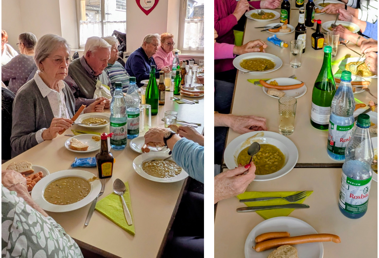 Heute fand im AWO-Klub Schierstein wieder unser beliebtes gemeinsames Mittagessen statt. Auf dem Speiseplan stand eine deftige, hausgemachte Erbsensuppe mit Würstchen – frisch zubereitet von unserem Küchenteam. Der Klub war gut gefüllt, die Stimmung herzlich und gesellig.