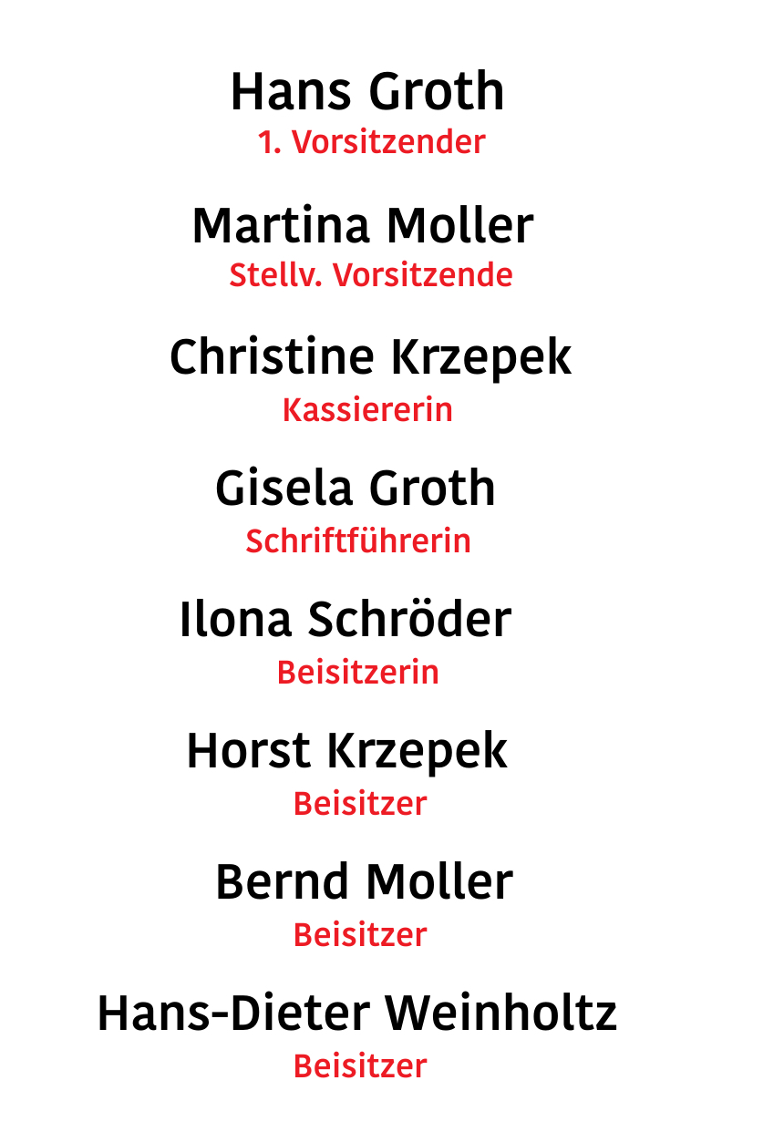 Auch die Beisitzer Ilona Schröder, Horst Krzepek und Hans-Dieter Weinholtz wurden erneut in ihren Funktionen bestätigt. Neu in den Kreis der Beisitzer wurde Bernd Moller gewählt und verstärkt somit das Team. Als Kassenprüfer wurden Herbert Heinzmann und Heinz Schonk gewählt.