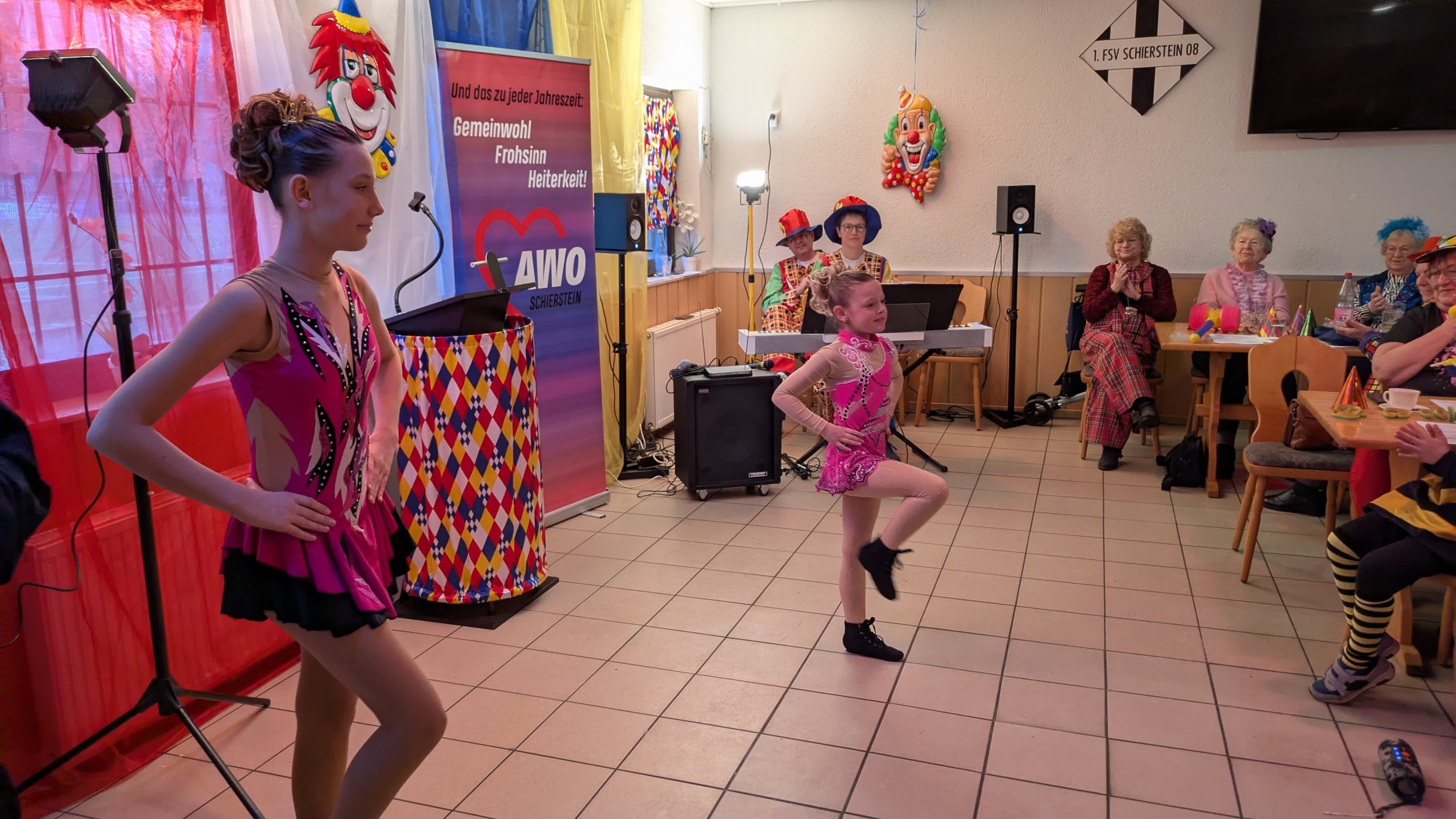 Flott unterwegs waren die beiden Garde-Tänzerinnen der Carnevalsfreunde Wiesbaden, Luisa Kahle und Apolina Kraus. Ihnen stehen noch viele Fastnachtskampagnen bevor, und sie werden hoffentlich noch lange von Mara Haas trainiert und betreut. Marlene und Clara zeigten in ihrem Feuerwehrtanz wie man richtig mit dem Löschschlauch umgeht. Tatü-Tata, die Feuerwehr war da.